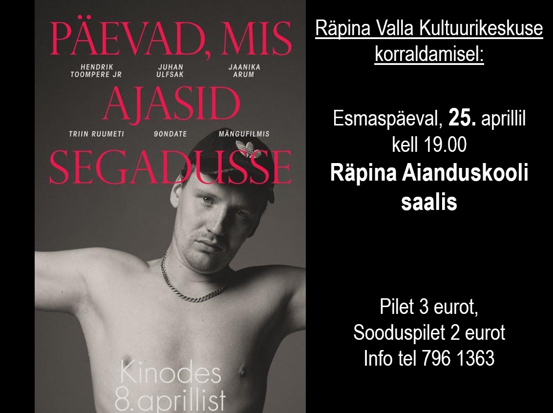 Kino “Päevad mis ajasid segadusse” Kalender Lisa kalendrisse Add to Timely Calendar Lisa Google kalendrisse Lisa Outlook kalendrisse Add to Apple Calendar Add to other calendar Export to XML Aeg: 25. apr. 2016 kell 19:00 2016-04-25T19:00:00+03:00 2016-04-25T19:30:00+03:00 Koht: Räpina aianduskooli saal Pargi 32 Räpina, 64505 Põlva maakond Eesti Piletiinfo: Pilet 3 eurot, sooduspilet 2 eurot Kontaktinfo: Räpina Valla Kultuurikeskus 799 6363 e-post Räpina Vallavalitsus jaga