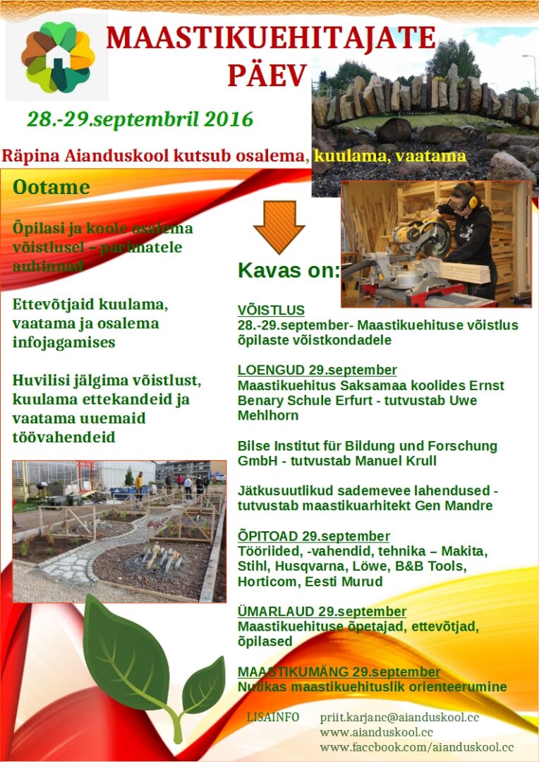 Maastikuehitajate päev Räpina Aianduskoolis Kalender Lisa kalendrisse Add to Timely Calendar Lisa Google kalendrisse Lisa Outlook kalendrisse Add to Apple Calendar Add to other calendar Export to XML Aeg: 28. sept. 2016 kell 09:00 Kordus 2016-09-28T09:00:00+03:00 2016-09-28T09:15:00+03:00 Koht: Räpina Aianduskool Pargi 32 Räpina, 64505 Põlva maakond Eesti Piletiinfo: Tasuta Kontaktinfo: Räpina Aianduskool 796 1397 e-post Veebileht Räpina Vallavalitsus Maastikuehitajate päev Räpina Aianduskoolis jaga