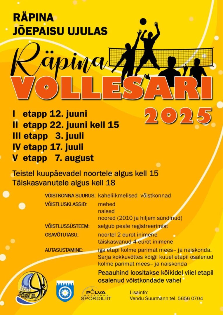 Räpina suvevolle 2025 Kalender Lisa kalendrisse Add to Timely Calendar Lisa Google kalendrisse Lisa Outlook kalendrisse Add to Apple Calendar Add to other calendar Export to XML Aeg: 7. aug. 2025 kell 15:00 – 19:30 2025-08-07T15:00:00+03:00 2025-08-07T19:30:00+03:00 Koht: Räpina jõepaisu ujula Kontaktinfo: Räpina Spordiklubi 56560704 Veebileht Räpina Spordiklubi sport jaga