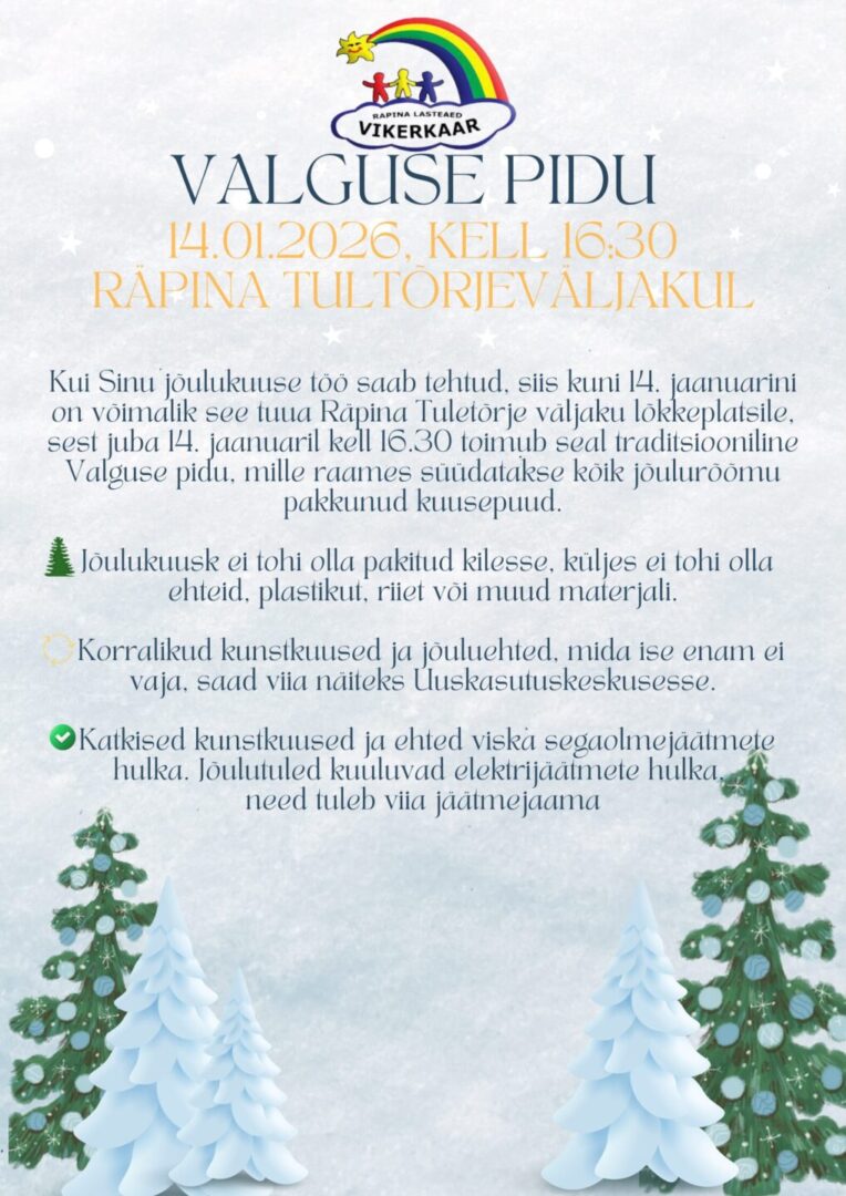 Valguse pidu Räpina Tuletõrjeväljakul Kalender Lisa kalendrisse Add to Timely Calendar Lisa Google kalendrisse Lisa Outlook kalendrisse Add to Apple Calendar Add to other calendar Export to XML Aeg: 14. jaan. 2026 kell 16:30 2026-01-14T16:30:00+02:00 2026-01-14T16:45:00+02:00 Piletiinfo: Tasuta Kontaktinfo: Räpina Lasteaed Vikerkaar Räpina Tuletõrjeväljak Sündmus jaga