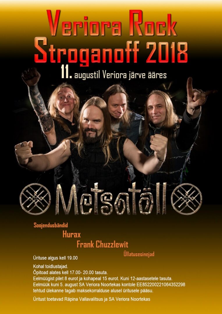 Veriora Rock Stroganoff Kalender Lisa kalendrisse Add to Timely Calendar Lisa Google kalendrisse Lisa Outlook kalendrisse Add to Apple Calendar Add to other calendar Export to XML Aeg: 11. aug. 2018 kell 17:00 2018-08-11T17:00:00+03:00 2018-08-11T17:15:00+03:00 Koht: Veriora järve ääres Veriora Põlva maakond Eesti Piletiinfo: 8-15 eurot, kuni 12-aastasele tasuta Kontaktinfo: SA Veriora Noortekas 55699330 e-post Veriora rahvamaja Õpitoad alates kl 17, kontsert alates kl 19 jaga